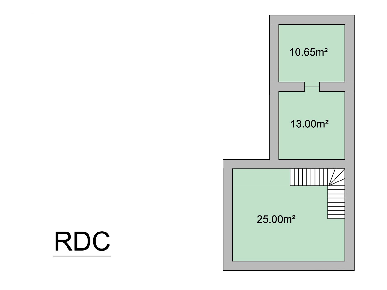 - Au rez-de-chaussée, une pièce principale d’environ 25 m², ainsi que deux pièces supplémentaires de 13 m² et 10,65 m², offrant diverses possibilités d’aménagement.